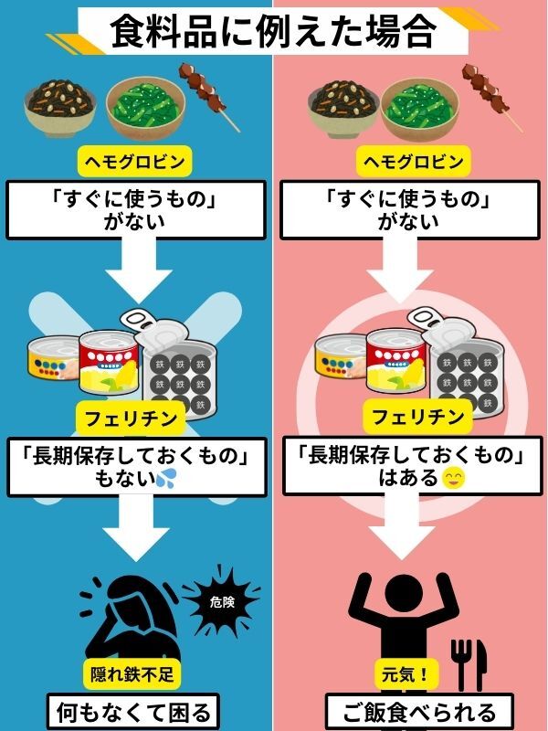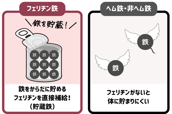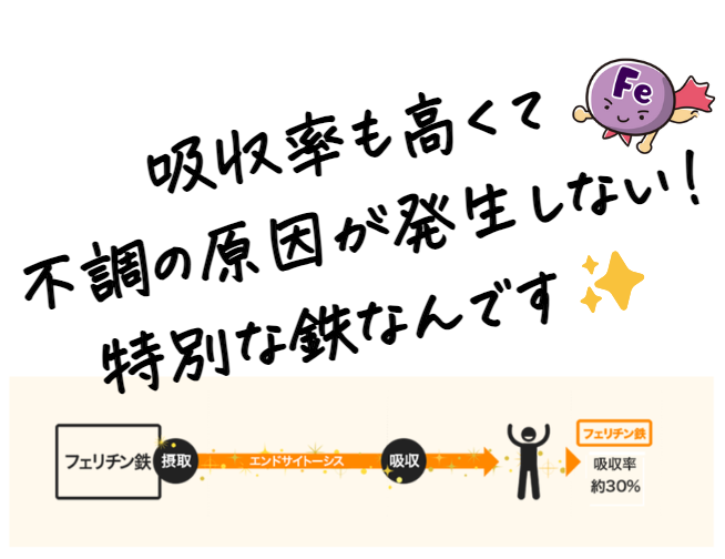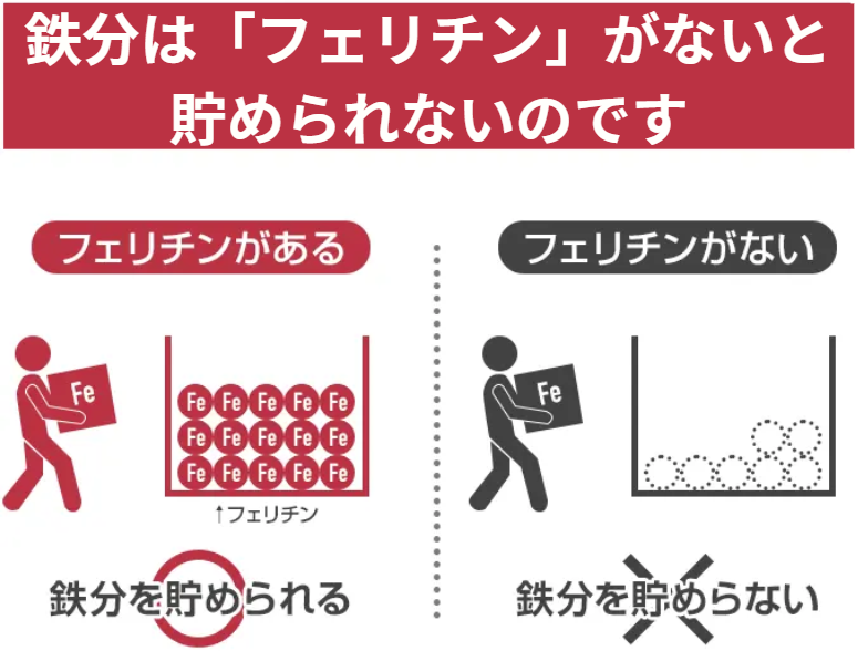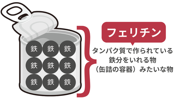 鉄分を貯めてくれるタンパク質。 「フェリチン」は鉄を抱え込んで貯蔵する働きがある。※
